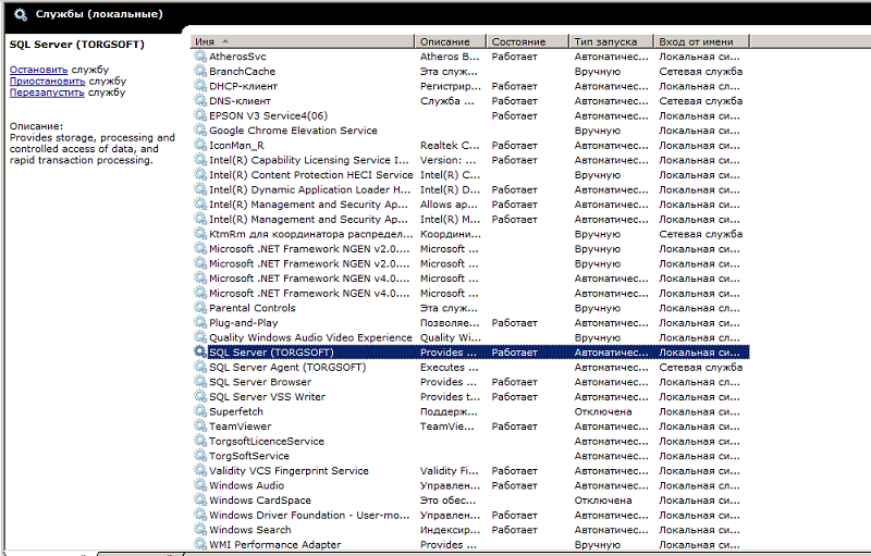 The running system service "SQL Server" is a REQUIRED condition for the program and your database to work. You can check the operation of the service, for example, by running the command "services.msc" in the search or in the command line or Start - Search - Services. In the window that opens, you need to find the service named SQL Server and make sure that it has the "Running" status. If the "Status" field is empty, you need to right-click on the service and click "Start". There can be many reasons for stopping the service, so we recommend that you regularly restart the computer where the program is installed two to three times a week. You can restart the program either manually or set it to run automatically when no one is working in the program.