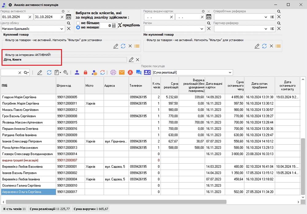 For example, in the program menu item "Buyer activity analysis", you can view revenue for a specific period for a particular user or all clients, by product type, across the entire sales network or a single store.