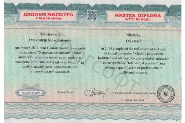 - 2014 жылғы 27 маусымда "Харьков политехникалық институты" ұлттық техникалық университетінің зияткерлік меншік мамандығы бойынша үздік дипломы XA № 47345869.