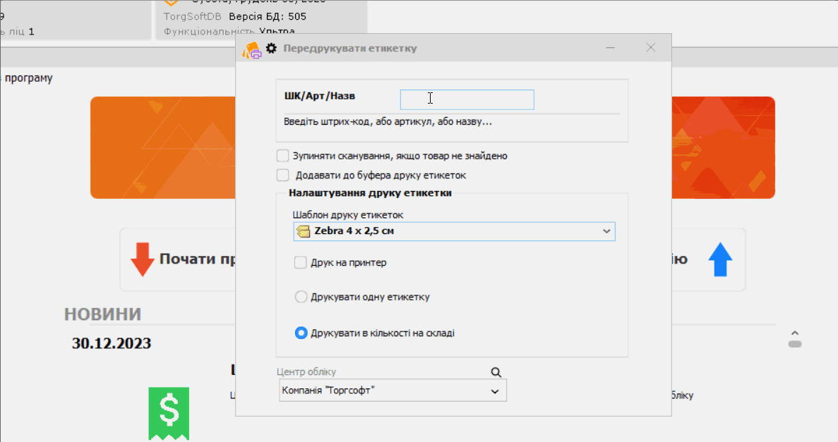 - Accesați Torgsoft → Managementul mărfurilor → punctul de meniu "Reprint label" (Reimprimare etichetă).