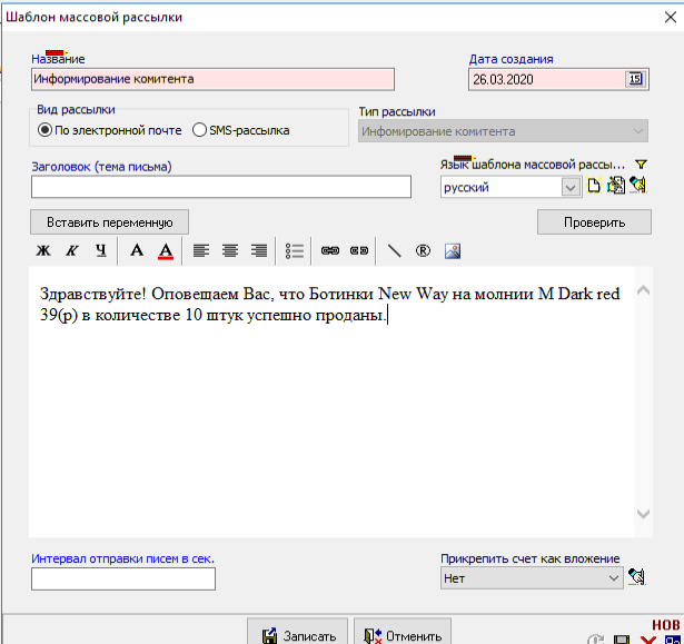 В поле «Назва» необхідно вказати назву шаблону розсилки. В поле «Тип розсилки» автоматично зазначений тип «Інформування комітента». За допомогою перемикача через електронну пошту або SMS-розсилка вкажіть, яким чином буде здійснюватися розсилка повідомлень. В поле «Створив» автоматично зобразиться роль тієї людини, яка створила цей шаблон. В поле Тема (тема листа) необхідно ввести заголовок повідомлення, яке створюється (за умови, якщо вибрано через електронну пошту). В поле Зміст шаблону вводимо текст листа або повідомлення. При натисканні на кнопку «Вставити змінну», є можливість вибрати змінну зі списку можливих. Тому, що обраний тип розсилки, Інформування комітента додаються змінні, які належать до даного типу розсилки: <Найменування товару>; <Артикул товару>; <Сума постачальника проданого товару>; <Кількість проданого товару>. Ці змінні вам дозволять підібрати товари, які ви відправите вашим партнерам в розсилці.