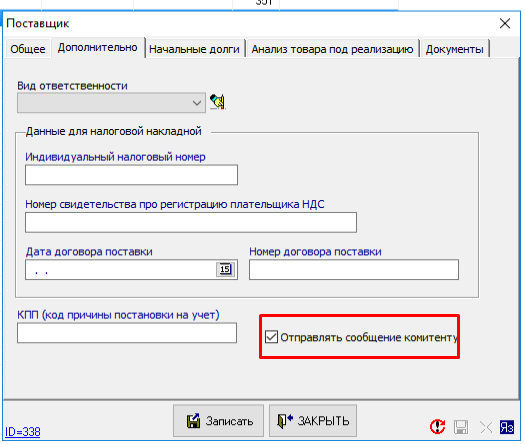 У разі, якщо потрібно виключити якогось постачальника з розсилки повідомлень. Для цього необхідно зайти в картку постачальника «Налаштування» - «Постачальник» - вкладка «Додатково» і вимкнути перемикач «Відправляти повідомлення комітенту».